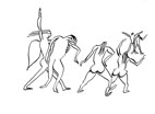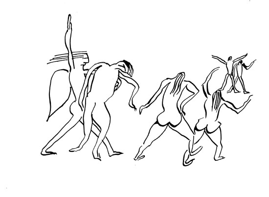 A szegény parasztok meg csak jöttek, jöttek, nem nézve se jobbra, se balra, de lógó fejjel, imádkozva, tilinkózva, szinte öntudat nélkül bandukolva. Elől ment a két muzsikus: egy férfi meg egy asszony. A férfiről a fene tudta volna megmondani, hogy gyimesi csángó vagy arméniai cigány: jól rászögelte a tokáját a hegedűre, olyan laposan csúszott égő fekete pillantása a keze felé, ahol a hegedű nyakát vakargatta, mint maguk a húrok, melyek alatt vastag rétegben ragadt a gyanta őszi légyszar-pora. Fején kis stanicli-sapka, térdig érő ing, rajta sajtnál érettebb, bőrös-pitykés bekeccsel. Aztán formátlan kályhacső gatya: oly mindegy, hogy ikrájától a combja felé, vagy fentről a vádli irányában nézzük a dolgot, vacak fácsni az egész. Mellette a másik zenész: eszelős boszorkány, röhögve néz maga elé a semmibe, széles bivalybőr szíjjal van a hasára kötve egy nagybőgőszerű hangszer. Fantasztikus ez a sovány hárpia ezzel az otromba tücsök-koporsóval: mint egy ezervonalú arc, ha orbánc gyúrja egyetlen rákvörös krumplivá, úgy viszonylik egy olasz delfin-hegedű ehhez a balog cini-cini bim-bim kántus-kofferhoz.