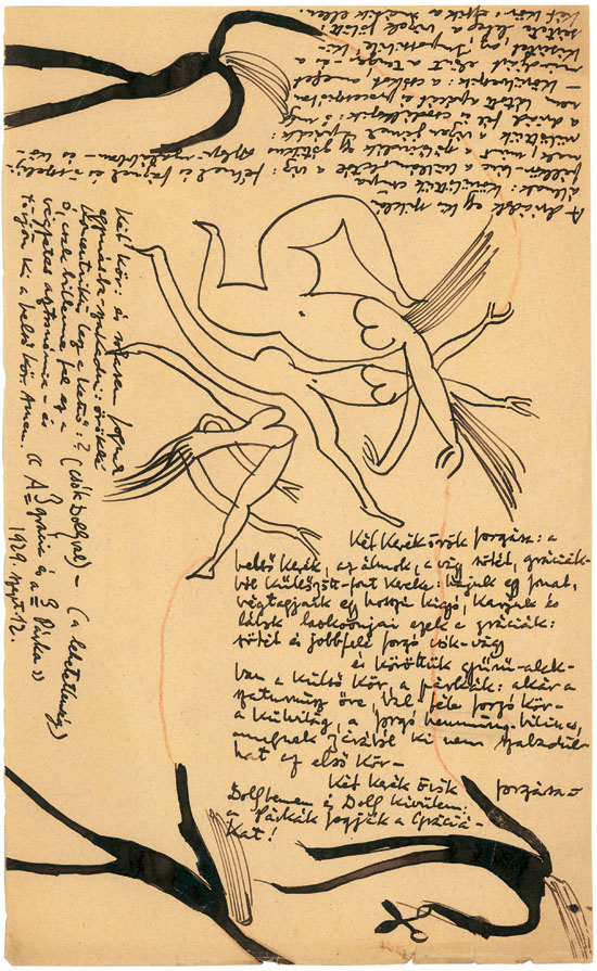 „A rajz hűsít: ha felnézek a fák optikai mozaikjára, millió kontúr élessége hűsít.” „Rajzolni, rajzolni: mellékes, hogy festő vagyok-e vagy sem, rajzolnom kell!” - vallja Szentkuthy Az egyetlen metafora felé című naplójegyzeteiben (1935).