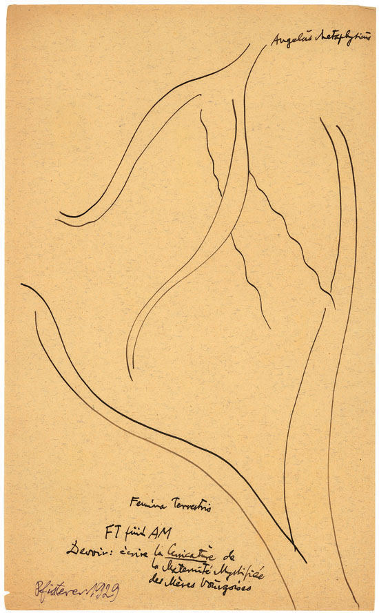 Felidézi tehát, mint gyóntató-hitvalló az egész világegyetemet, ezt a személyére szabott univerzumot (amellyel saját belső „misztikus malmán” v. fantázia-malmán keresztül őrölte meg tapasztalatait), - tehát ez az egész univerzum visszatükröződik rajzain is. (Rajzainak különböző témáit: lásd később).