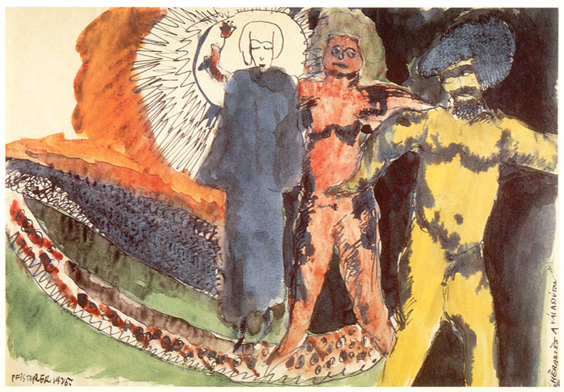 Itt jut eszembe a gyónó-hitvalló mellett még egy jellembeli kettőssége: ez pedig Szentkuthy a faggatott-faggató. „A világ faggatottja vagyok...” - vallotta, vagyis a megoldhatatlan végső kérdések folyton dobolva, harsogva adnak életjelt magukról saját belső világában. Ugyanakkor faggatóvá is vált az idők folyamán. Látva néhány rajzát: A zarándokok megkísértése, a – cím nélküli – háttal látható elcsigázott zöld emberkék vonulása-emigrációja, Az őrangyalok napja, stb., - és olvasva korai naplójában néhány szavas leírását a Budapesten 1931-ben megtartott összehasonlító irodalomtörténeti konferencia résztvevőiről, ezeket a humoros, groteszk villámportrékat, pontosan érzékeljük, mit jelentett számára a valóság, pontosan az általa stilizált valóság.